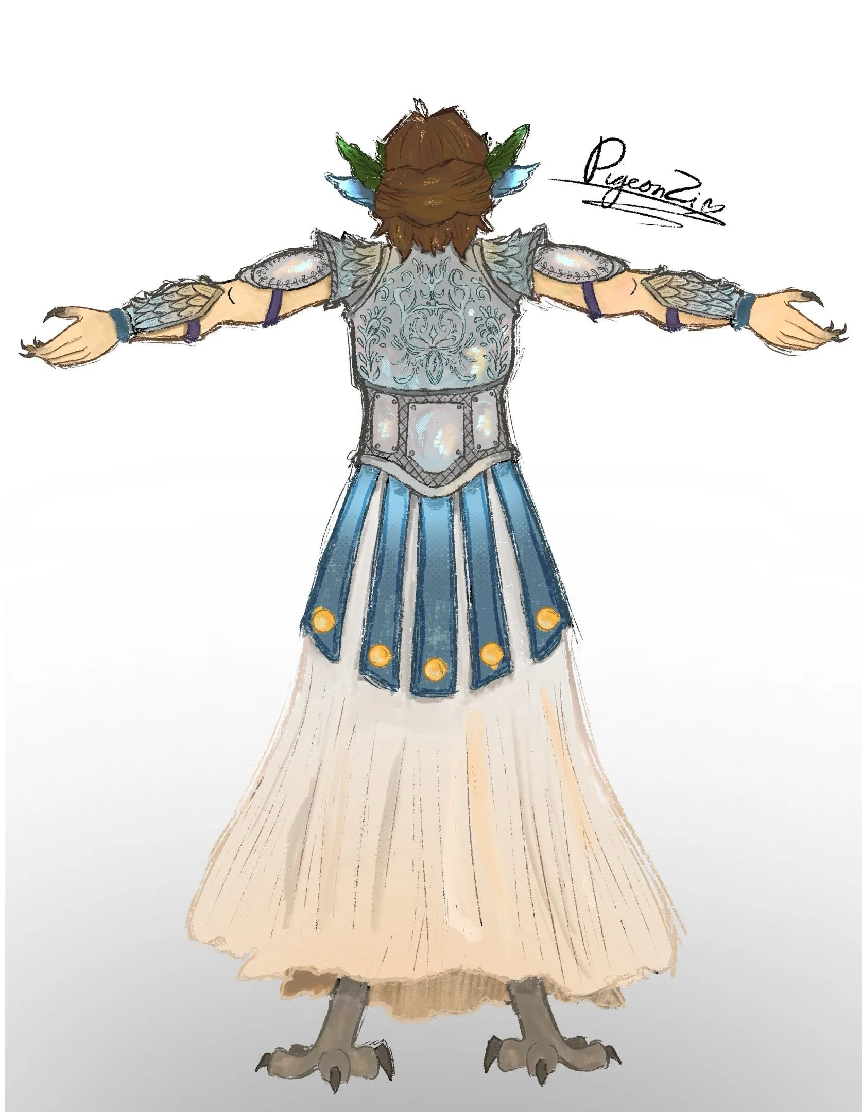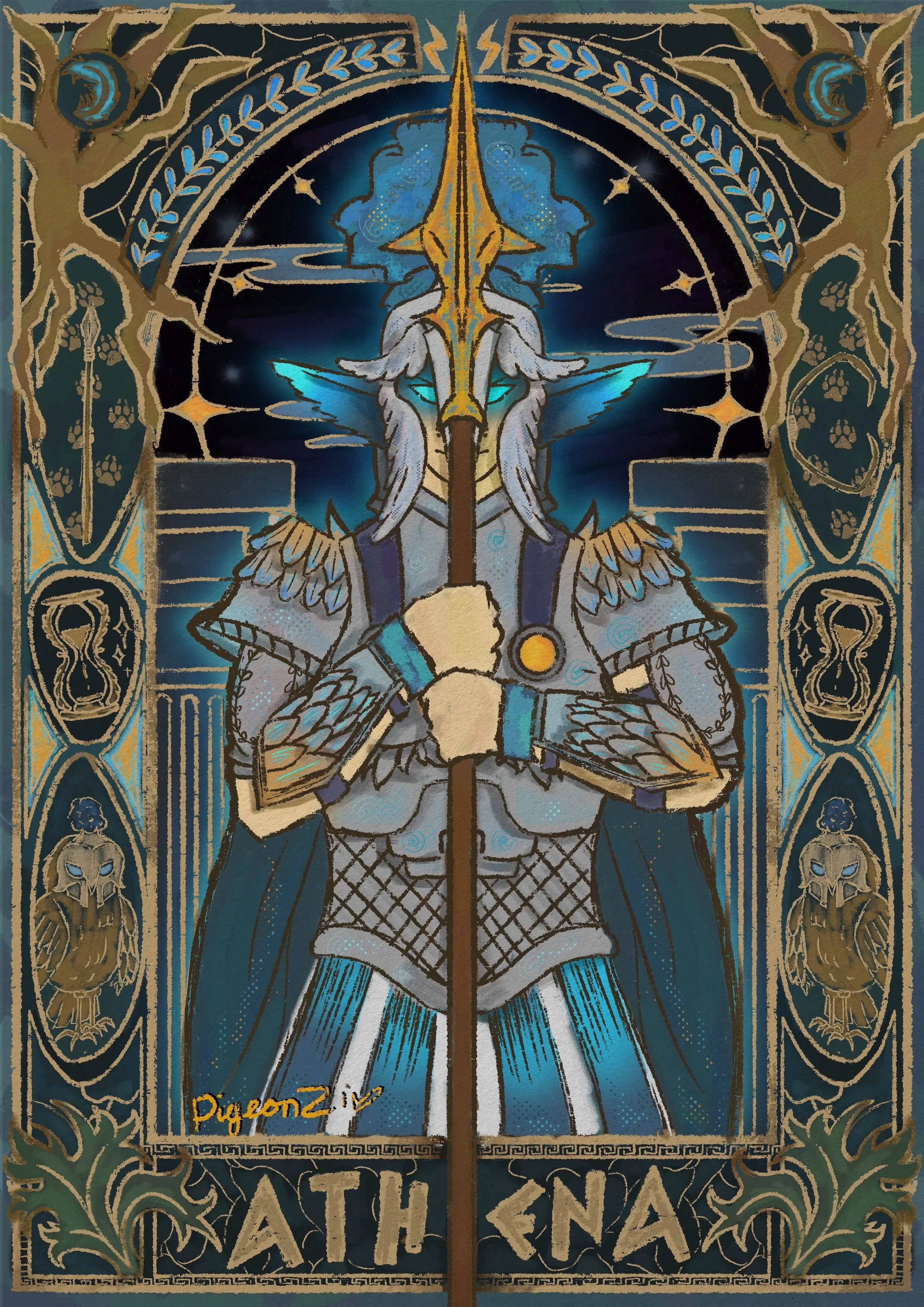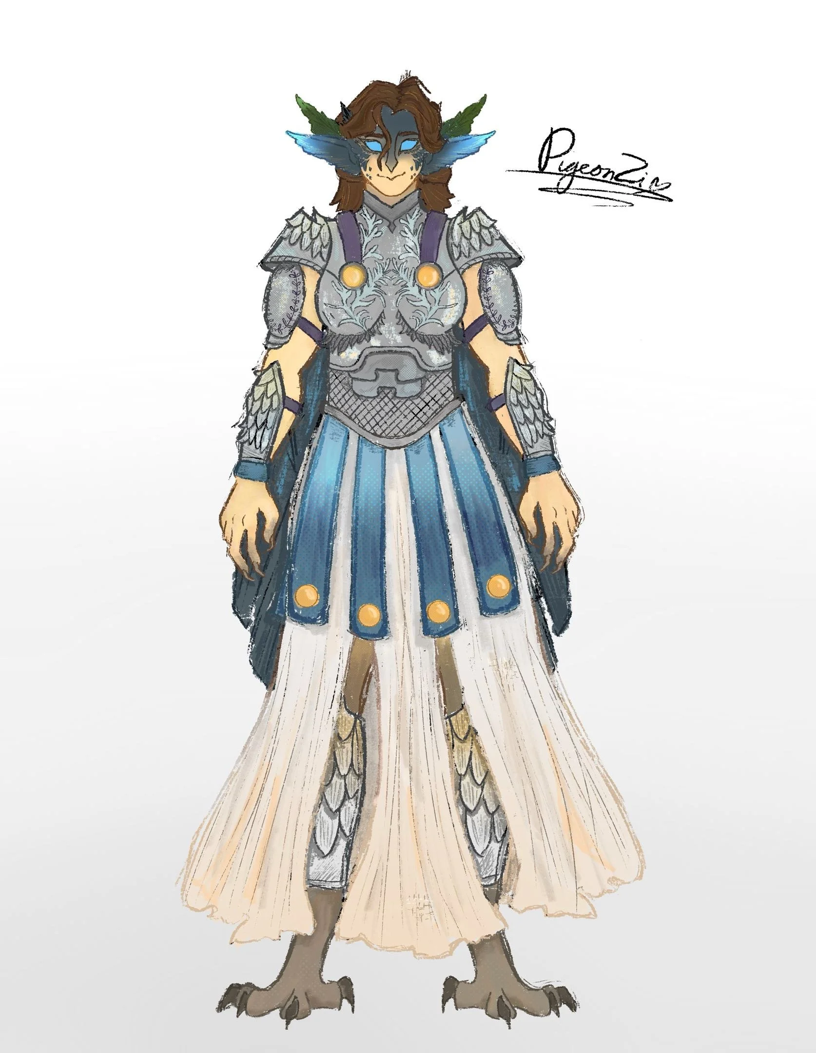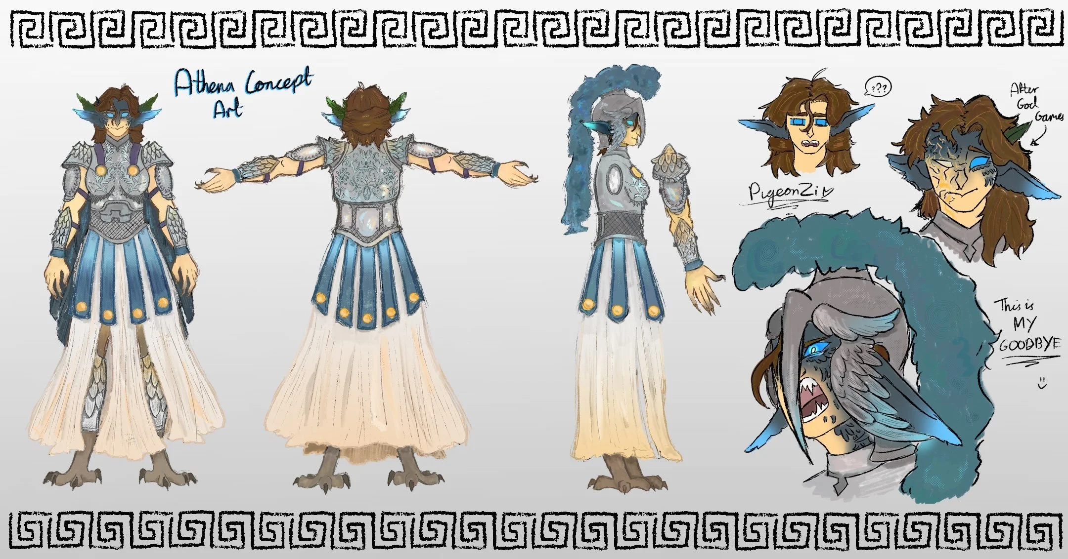 I have loved Epic The Musical for a while, and what better way than to honour it with concept art of the characters? Athena, God of War, is displayed consistently with owl motifs and a blue hue in animatics. With my own creative liberty, I wanted to honour her with an intricate design worthy of a war god, but one of a mentor.